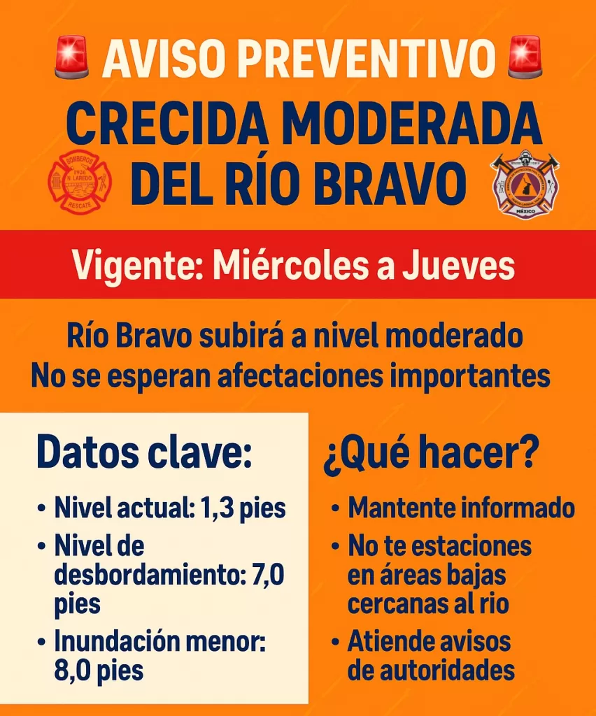 NUEVO LAREDO, TAM / LAREDO, TEX.- Autoridades de Protección Civil y Bomberos de Nuevo Laredo emitieron una alerta por creciente del río Bravo que afectará a la región fronteriza de los Dos Laredos a partir del miércoles 16 de julio y se mantendrá hasta la tarde del jueves 17, debido al aumento en el caudal generado por lluvias aguas arriba.