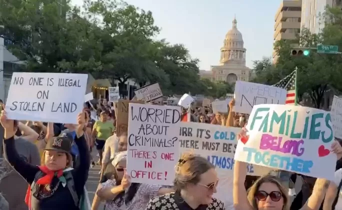 Miles de personas se congregaron en el centro de Austin con pancartas contra la política migratoria de Trump y su “autoritarismo”, según denunciaron los organizadores. Se estiman más de 2,000 protestas simultáneas en los 50 estados del país.