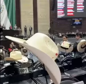 Diputados del PRI y PAN se manifestaron en San Lázaro con sombreros manchados de rojo y veladoras, exigiendo justicia por...