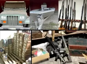 La FGR y Sedena realizaron un cateo en Abasolo donde aseguraron 10 armas largas, 36 mil cartuchos, vehículos y lanchas;...