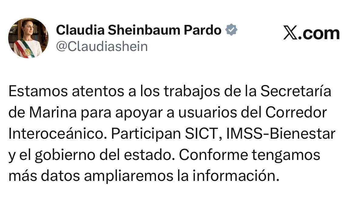 Tras conocerse el accidente, la presidenta Claudia Sheinbaum informó en redes sociales que el gobierno federal se sumó a las labores de apoyo para asistir a las personas afectadas por el descarrilamiento.