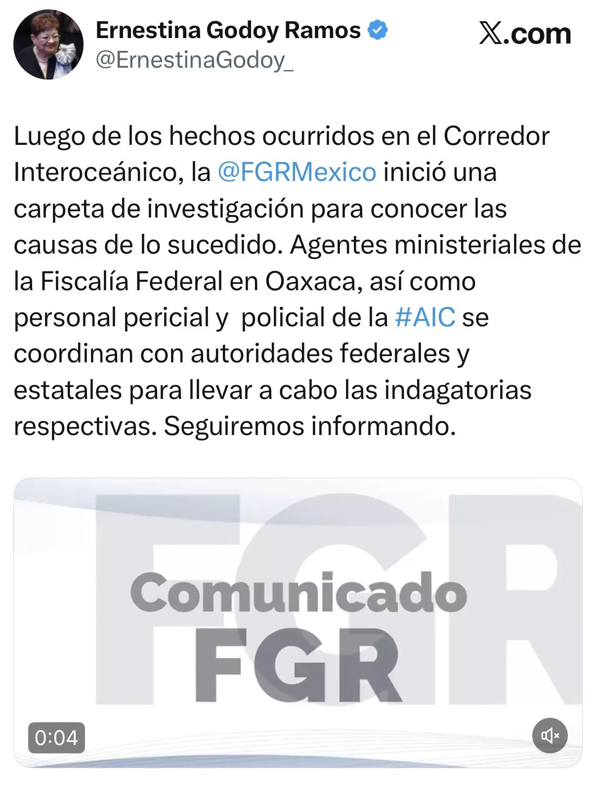 La titular de la FGR, Ernestina Godoy, indicó que agentes federales en Oaxaca, junto con personal pericial y policial de la AIC, ya trabajan en coordinación con autoridades estatales y federales.
