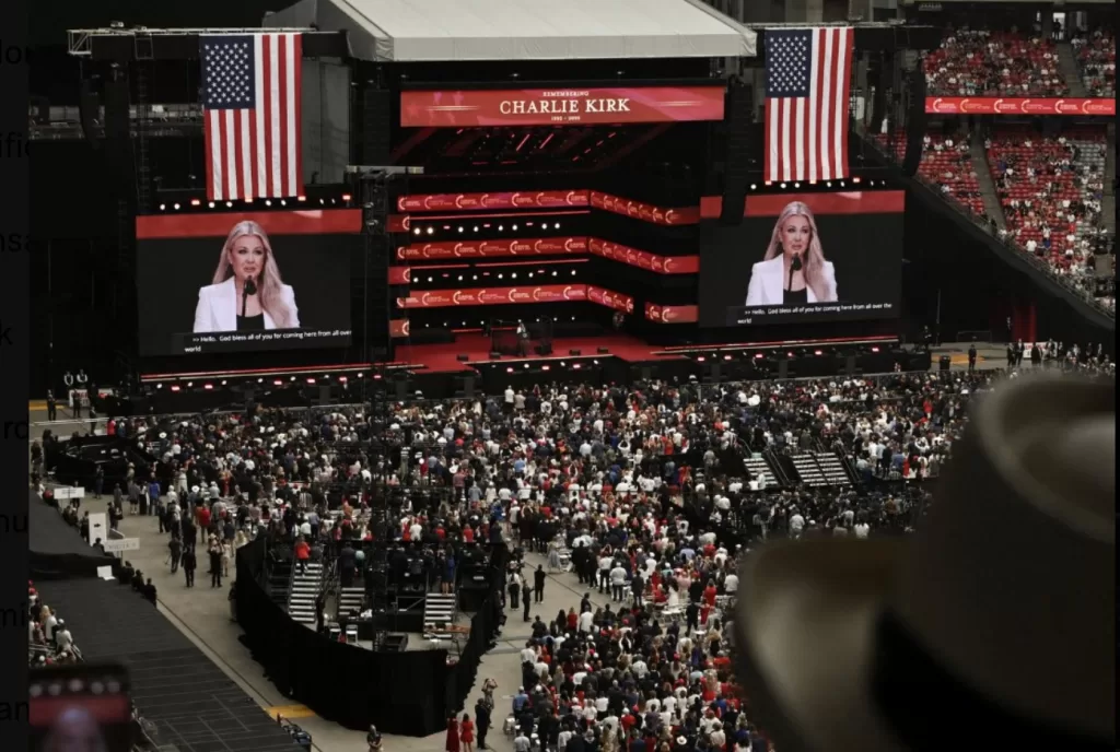 La multitud que llenó el estadio despidió a Kirk entre aplausos, lágrimas y mensajes de apoyo a su familia, mientras líderes políticos insistieron en que su legado continuará a través de Turning Point.