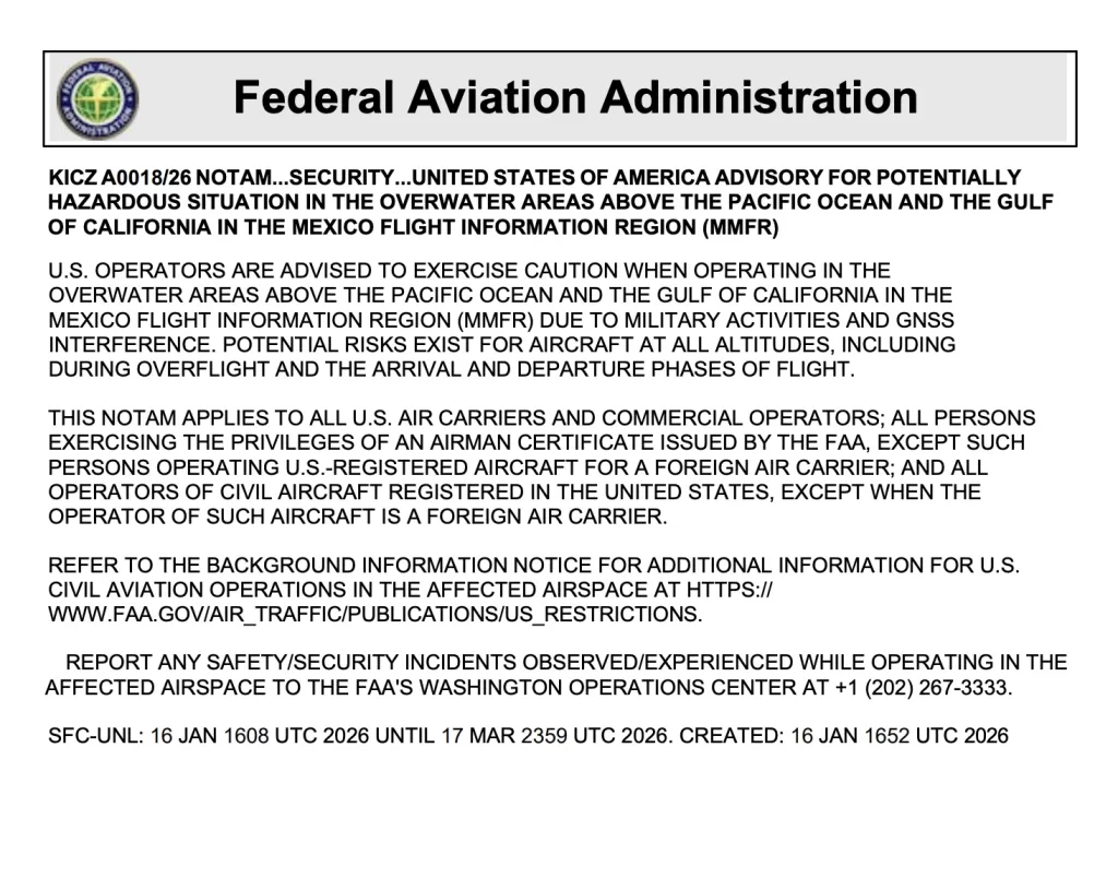 La FAA alerta a aerolíneas por posibles acciones militares e interferencias en el espacio aéreo de México y Latinoamérica hasta el 17 de marzo.