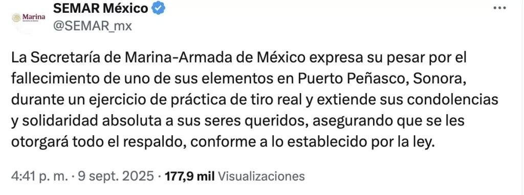 La Secretaría de Marina (Semar) informó este martes sobre la muerte del capitán Adrián Omar del Ángel Zúñiga, quien perdió la vida durante una práctica de tiro en Puerto Peñasco, Sonora.