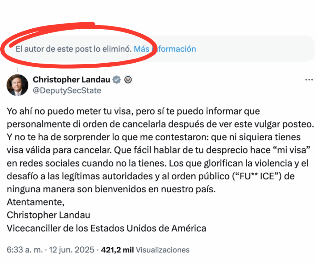 Pocos minutos después de la respuesta del funcionario estadounidense, Melissa Cornejo eliminó su publicación original y restringió el acceso a sus cuentas de X e Instagram.