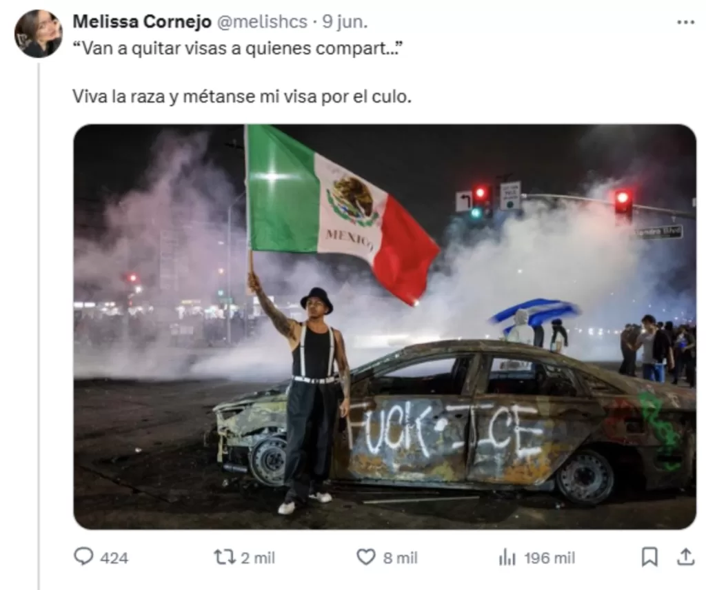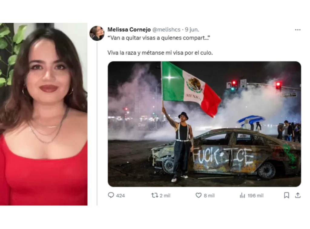 Todo comenzó cuando Melissa Cornejo publicó en su cuenta de X una fotografía tomada durante las protestas en Los Ángeles, donde se ve a un hombre ondeando una bandera de México frente a un automóvil con la frase “Fuck ICE” escrita en la parte trasera.