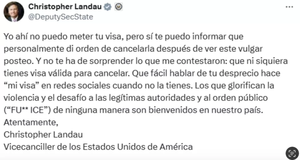 El exembajador y actual subsecretario del Departamento de Estado, Christopher Landau, respondió públicamente a través de su cuenta en la red social X, donde informó que solicitó la cancelación de la visa estadounidense de Cornejo. Sin embargo, la respuesta que recibió fue contundente: “ni siquiera tiene visa válida para cancelar”.