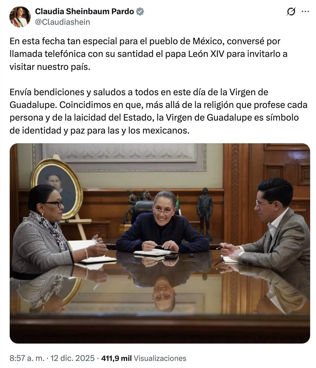 El anuncio fue realizado a través de una publicación en su cuenta oficial de X, donde la mandataria compartió una fotografía en la que aparece durante la comunicación. En el mensaje, explicó que la conversación tuvo lugar en una fecha de profundo significado para millones de personas, al coincidir con el Día de la Virgen de Guadalupe, una de las celebraciones religiosas más importantes del país.