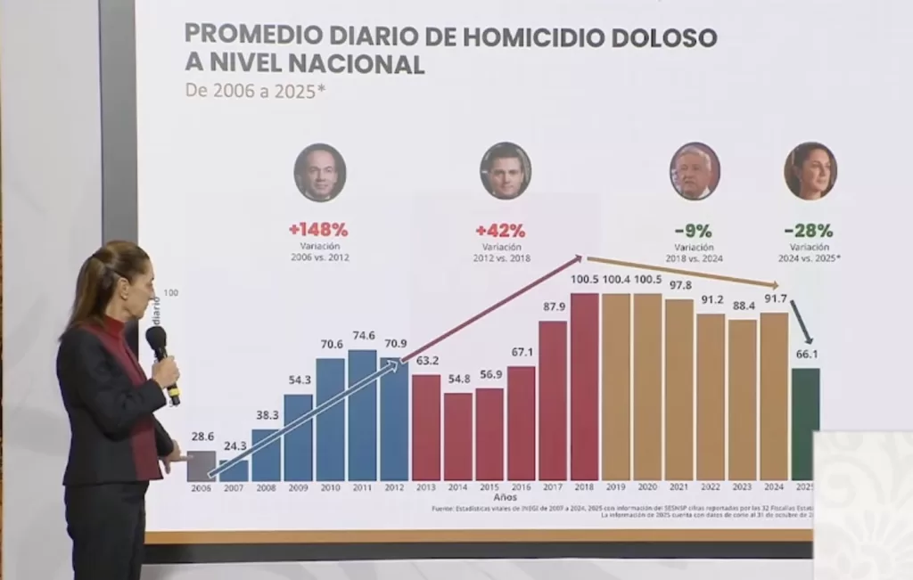 La presidenta Claudia Sheinbaum Pardo aseguró este martes que durante los primeros 13 meses de su administración, los homicidios dolosos en México se redujeron un 37%, al pasar de 86.9 casos diarios en septiembre de 2024 —último mes del sexenio de Andrés Manuel López Obrador— a 54.5 en octubre de 2025, lo que representa 32 asesinatos menos por día.