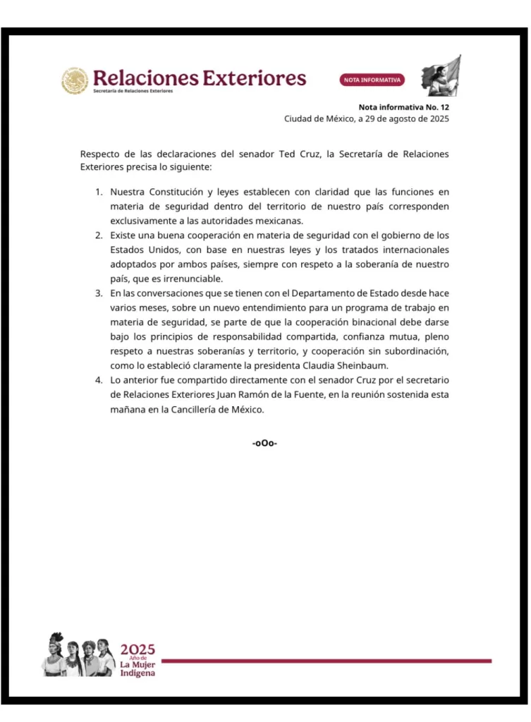 La Secretaría de Relaciones Exteriores (SRE) emitió un posicionamiento luego del llamado del senador republicano Ted Cruz, quien exhortó al gobierno de México a aceptar el apoyo de Estados Unidos en el combate a los cárteles, siguiendo la propuesta impulsada por el presidente Donald Trump.