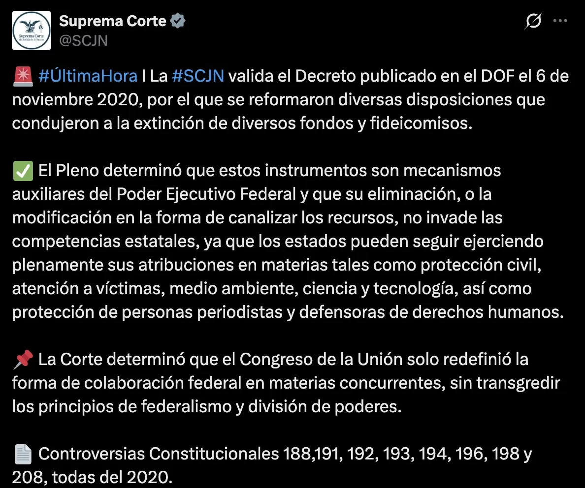 Sin embargo, el ministro ponente fue enfático al señalar la falta de sustento técnico en las quejas: “Las demandas plantearon argumentos genéricos sobre lo que consideraron bondades de los fondos y fideicomisos, pero no pusieron en evidencia la afectación a alguna atribución reconocida en la Constitución”. Con este fallo, se legitima el manejo de más de 68 mil millones de pesos que fueron concentrados en la Tesorería de la Federación.