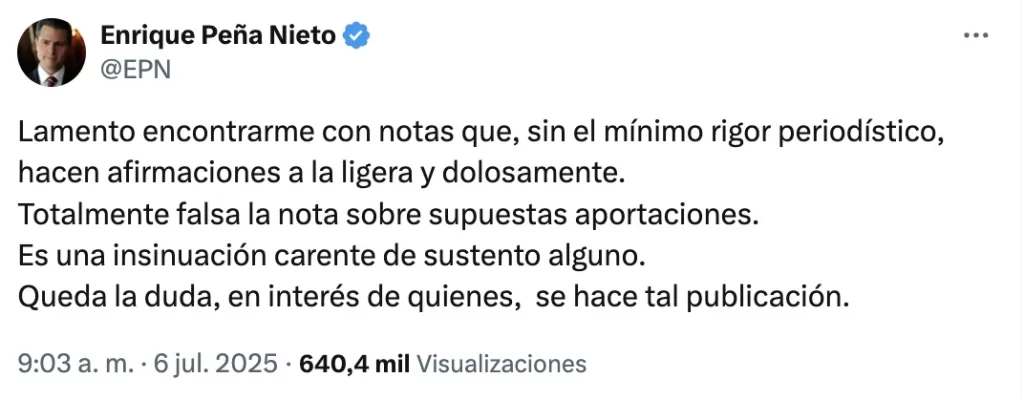 Hasta el momento, no existe una investigación oficial ni judicial en México sobre este tema, y Peña Nieto no ha dado entrevistas o declaraciones adicionales más allá del breve comunicado en su cuenta de X.