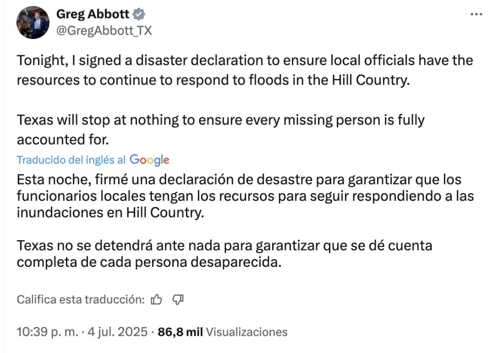 El Gobernador de Texas, Greg Abbot anunció que firmó una declaración de desastre para garantizar que autoridades estatales tengan los recursos para seguir respondiendo a las inundaciones en Hill Country y hacer un conteo exhaustivo de todas las personas desaparecidas.
