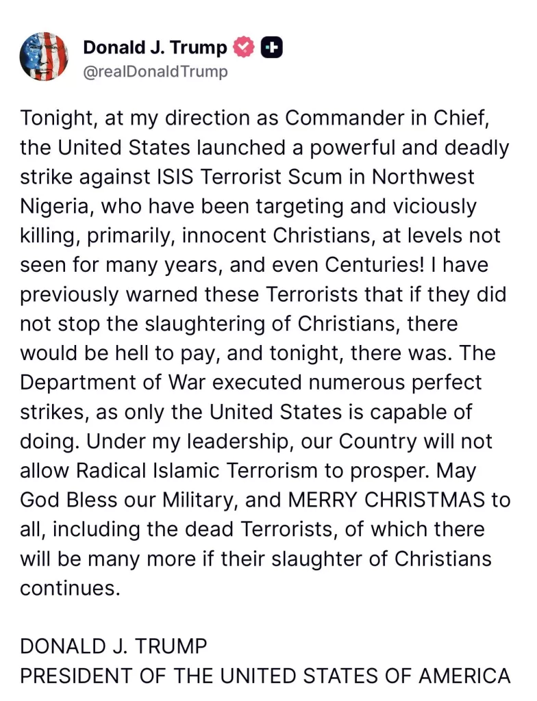 “Esta noche, bajo mi dirección como Comandante en Jefe, Estados Unidos lanzó un ataque poderoso y mortal contra la escoria terrorista de ISIS en el noroeste de Nigeria”, escribió Trump.