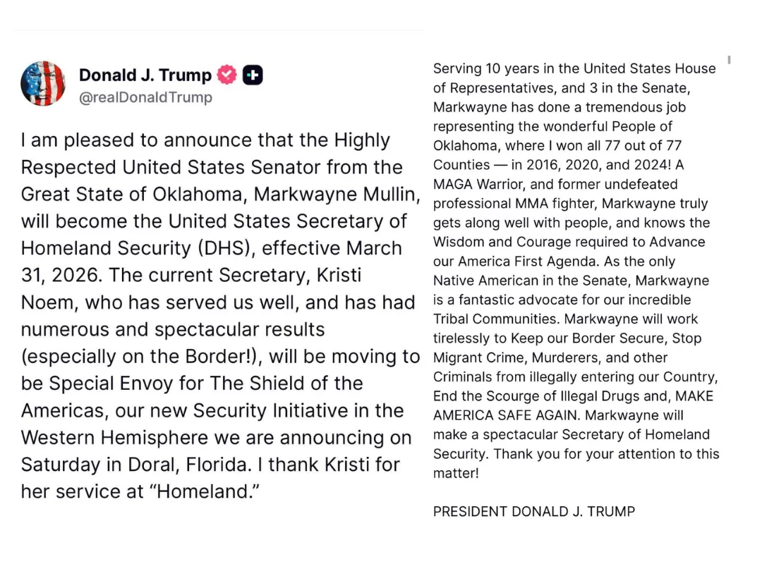 Con una trayectoria de una década en el Senado, Markwayne Mullin llega al gabinete con el respaldo total de la Casa Blanca. “Agradezco a Kristi por su servicio en ‘Homeland'”, escribió Trump en Truth Social, destacando la experiencia legislativa de Mullin como pieza clave para destrabar los fondos de la agencia.