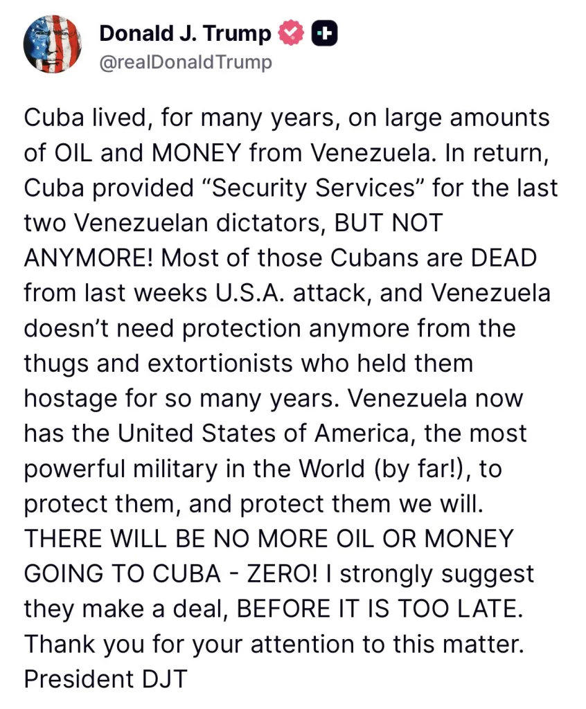 El mensaje incluyó una advertencia directa a la administración de La Habana: “¡No habrá más petróleo ni dinero (de Venezuela) para Cuba! ¡Cero!”. Además, Trump lanzó una sugerencia con tono de ultimátum: “Les sugiero (a Cuba) que lleguen a un acuerdo antes de que sea demasiado tarde”, alimentando los pronósticos de una inminente crisis política en la isla.