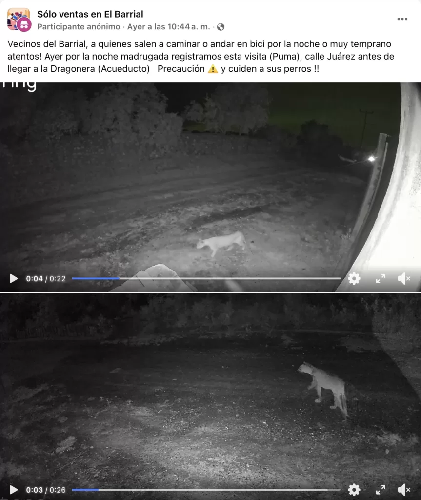 El avistamiento se registró la madrugada del martes 3 de junio, sobre la calle Juárez, antes de llegar a La Dragonera (Acueducto), según informaron habitantes del sector en redes sociales. Las imágenes, compartidas en el grupo vecinal “Sólo ventas en El Barrial”, muestran a un felino de gran tamaño merodeando en calma por la calle, sin aparente amenaza inmediata, pero sí con potencial riesgo para personas o mascotas.