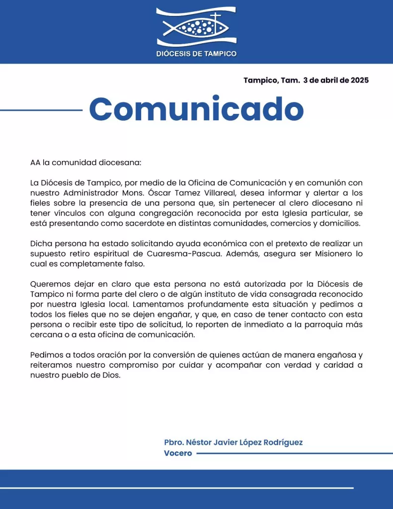 Mientras, la Diócesis de Tampico ha lanzado una advertencia urgente a la comunidad católica local, tras detectar la presencia de un individuo que se hace pasar por sacerdote para solicitar donativos económicos. A través de su Oficina de Comunicación, las autoridades eclesiásticas informaron que el sujeto en cuestión no forma parte del clero ni está afiliado a ninguna congregación religiosa reconocida por la iglesia católica en la región.